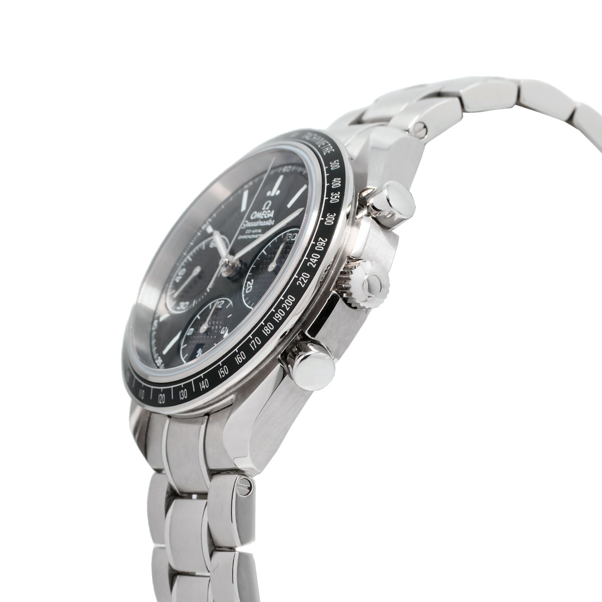スピードマスターの伝統と、レーシングスピリットを融合させた「スピードマスター レーシング」。本モデルは、精悍なブラックダイヤルに視認性の高いホワイトのインデックスと針を配し、クロノグラフとしての機能性と洗練されたデザインを両立しています。