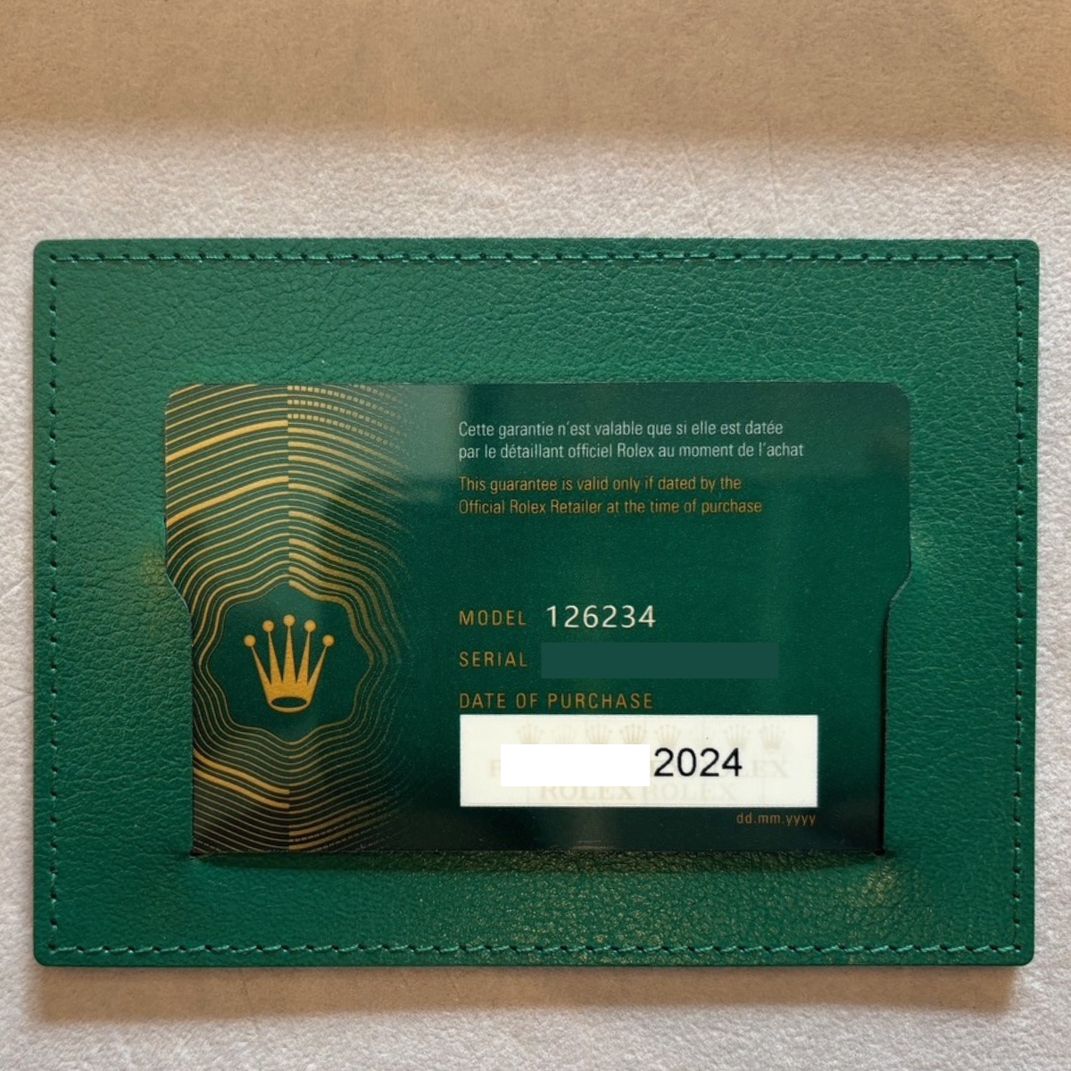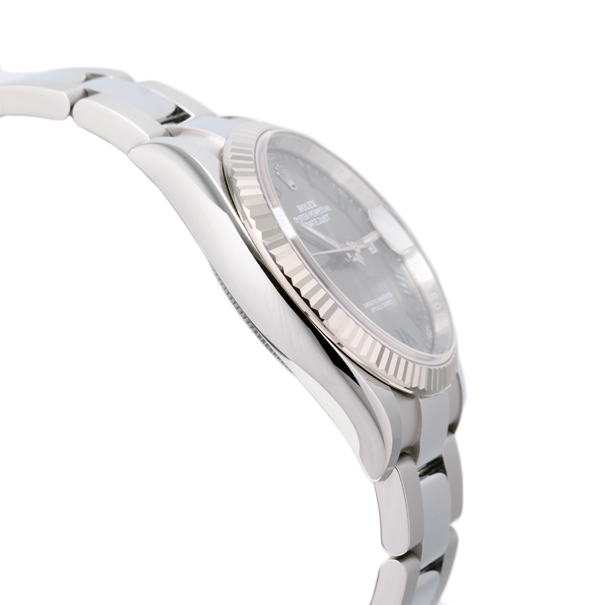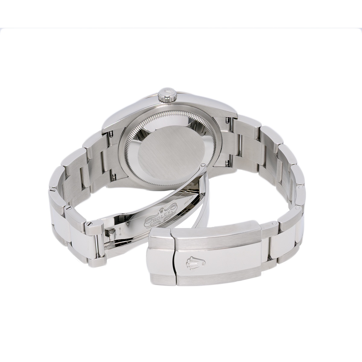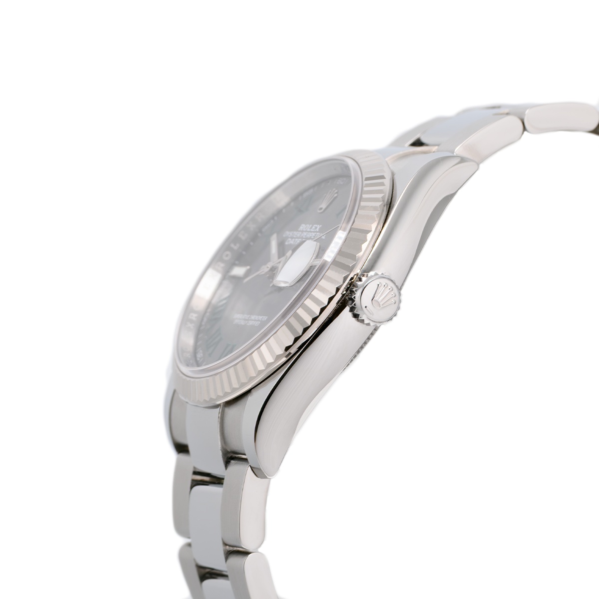 こちらのRef:126234は、ステンレススティールケースに18Kホワイトゴールド製フルーテッドベゼルを組み合わせ、落ち着いたスレートダイヤルを備えたモデルです。オイスターブレスレットのスポーティな印象と、ダイヤルのシックな色調が絶妙なバランスを生み出します。