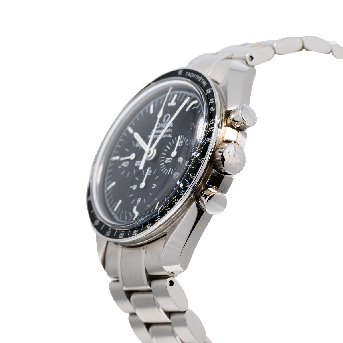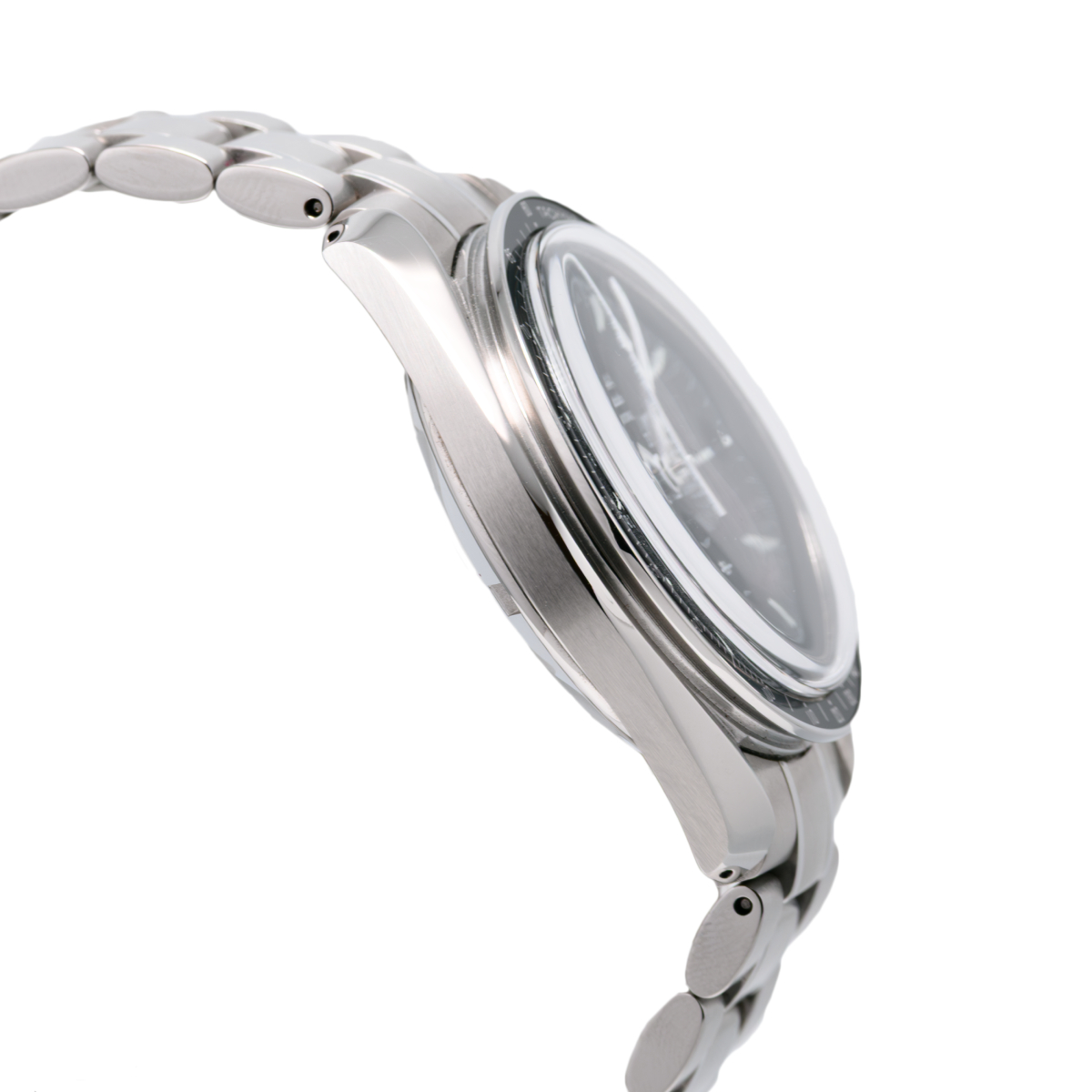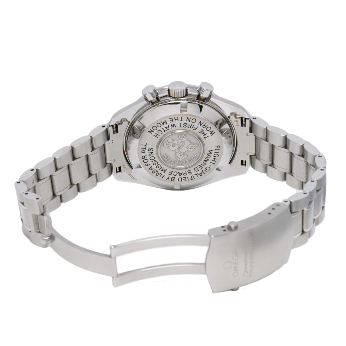 スピードマスターの王道、“ムーンウォッチ”の定番仕様がこの3570.50.00。42mmのステンレススチールケースにブラックのタキメーターベゼル、視認性の高い3カウンターのクロノグラフを備え、風防は伝統のヘサライト。裏蓋はソリッドで、NASAのフライト認定と“THE FIRST WATCH WORN ON THE MOON”の刻印が入る、まさに月面着陸由来のDNAをそのまま受け継いだ一本です。中身は手巻きクロノグラフの名機Cal.1861。安定性とメンテ性に優れ、約48時間のパワーリザーブ/21,600振動という実用スペックを誇ります。3570.50.00は1996年ごろに登場し、2014年頃に後継の311.30.42.30.01.005にバトンタッチするまで“ムーンウォッチ”の主役を担いました。