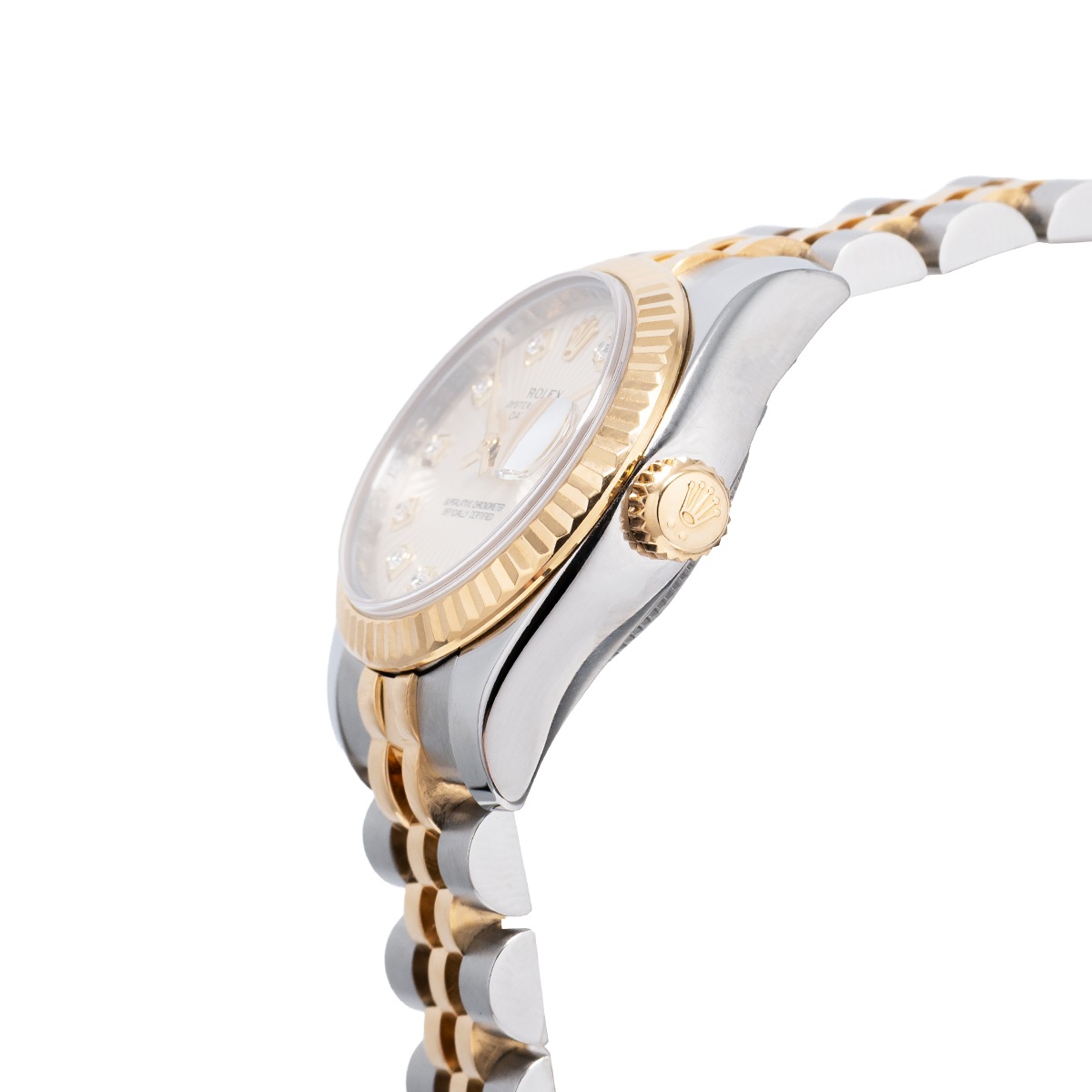 ステンレススティールと18Kイエローゴールドを組み合わせた「ロレゾール」ケースに、ロレックスらしいフルーテッドベゼルを備えた王道のスタイル。26mmという控えめなサイズ感ながら、サンレイ状に光を広げるサンビームダイヤルが表情豊かに腕元を彩ります。さらにインデックスにはダイヤモンドを配し、上品さと華やかさを両立させています。