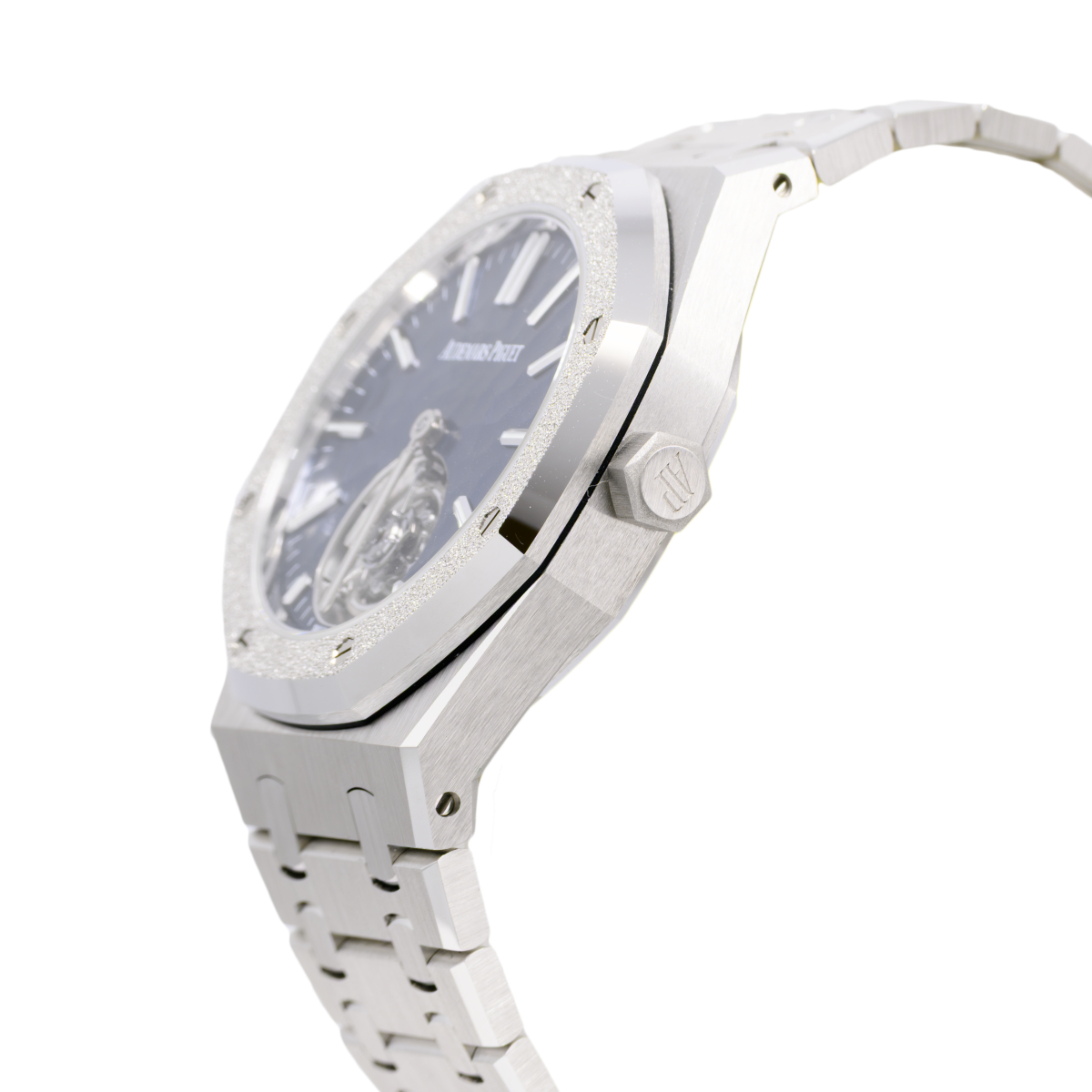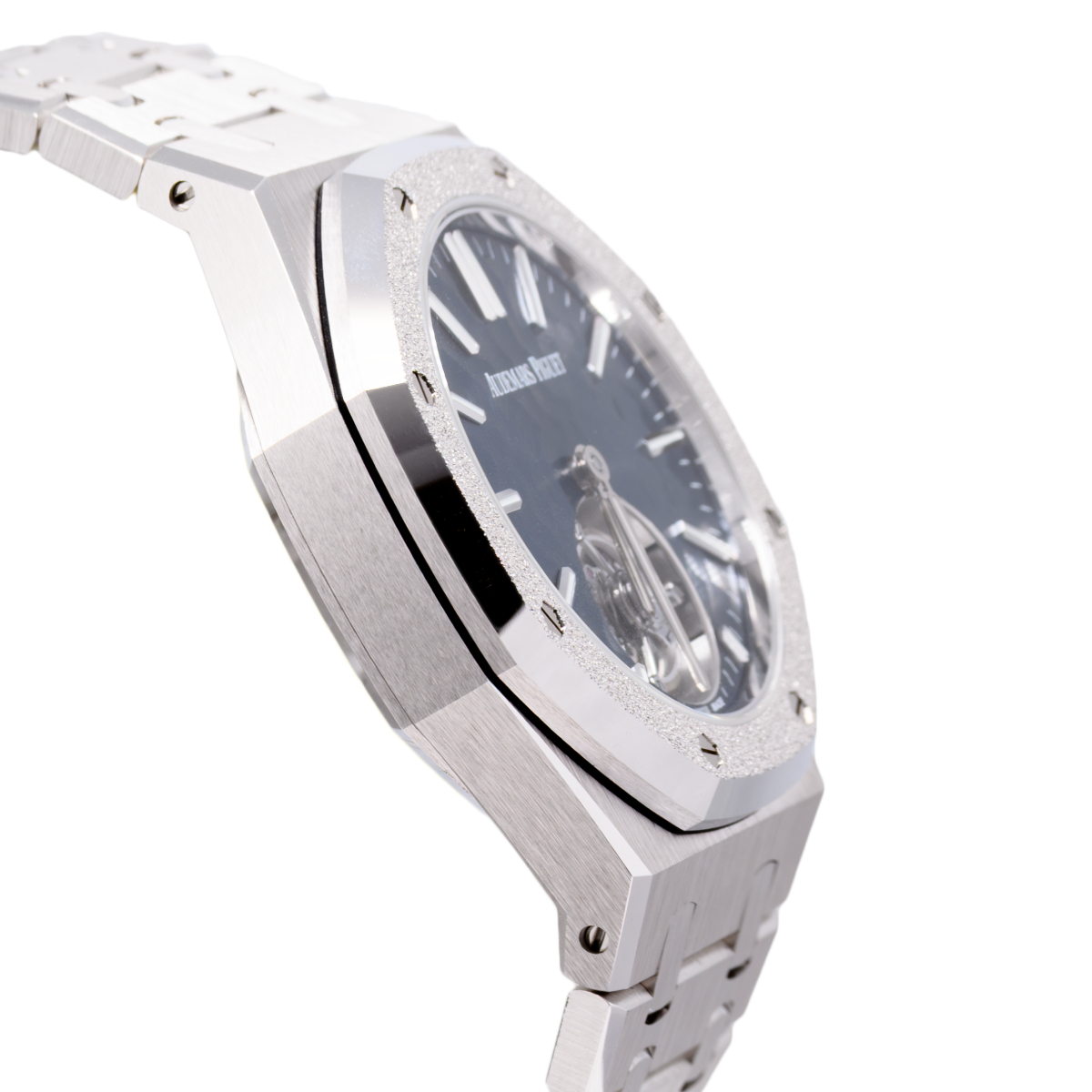 ロイヤル オーク フライング トゥールビヨンは、フロスト加工されたベゼルが採用されており、それ以外の仕様については、オーデマ ピゲが1年前に発表したアップデート版と同様の41mmで、「自動巻きCal.295」と6時位置にフライング トゥールビヨンを備えた最高傑作と言えるモデルです。