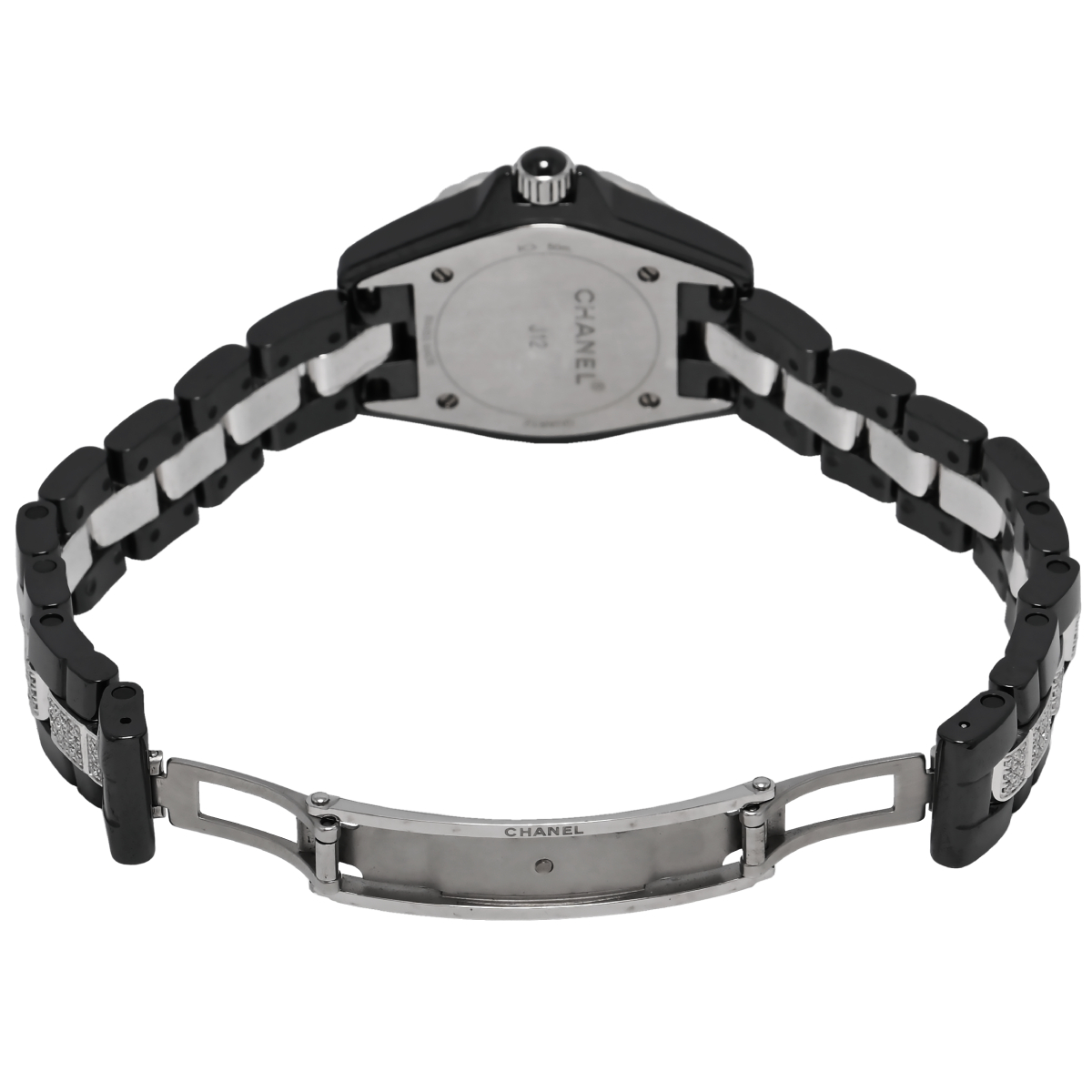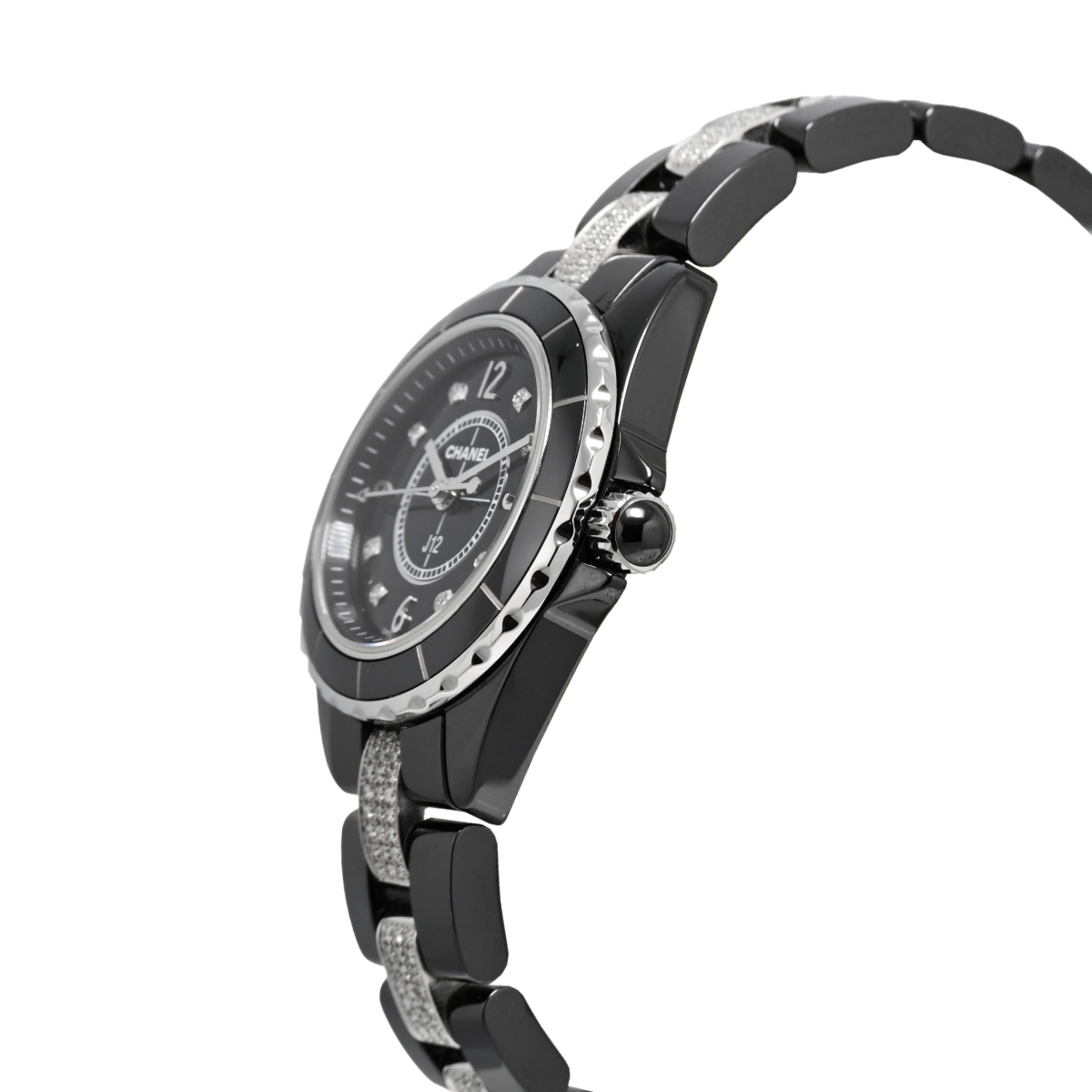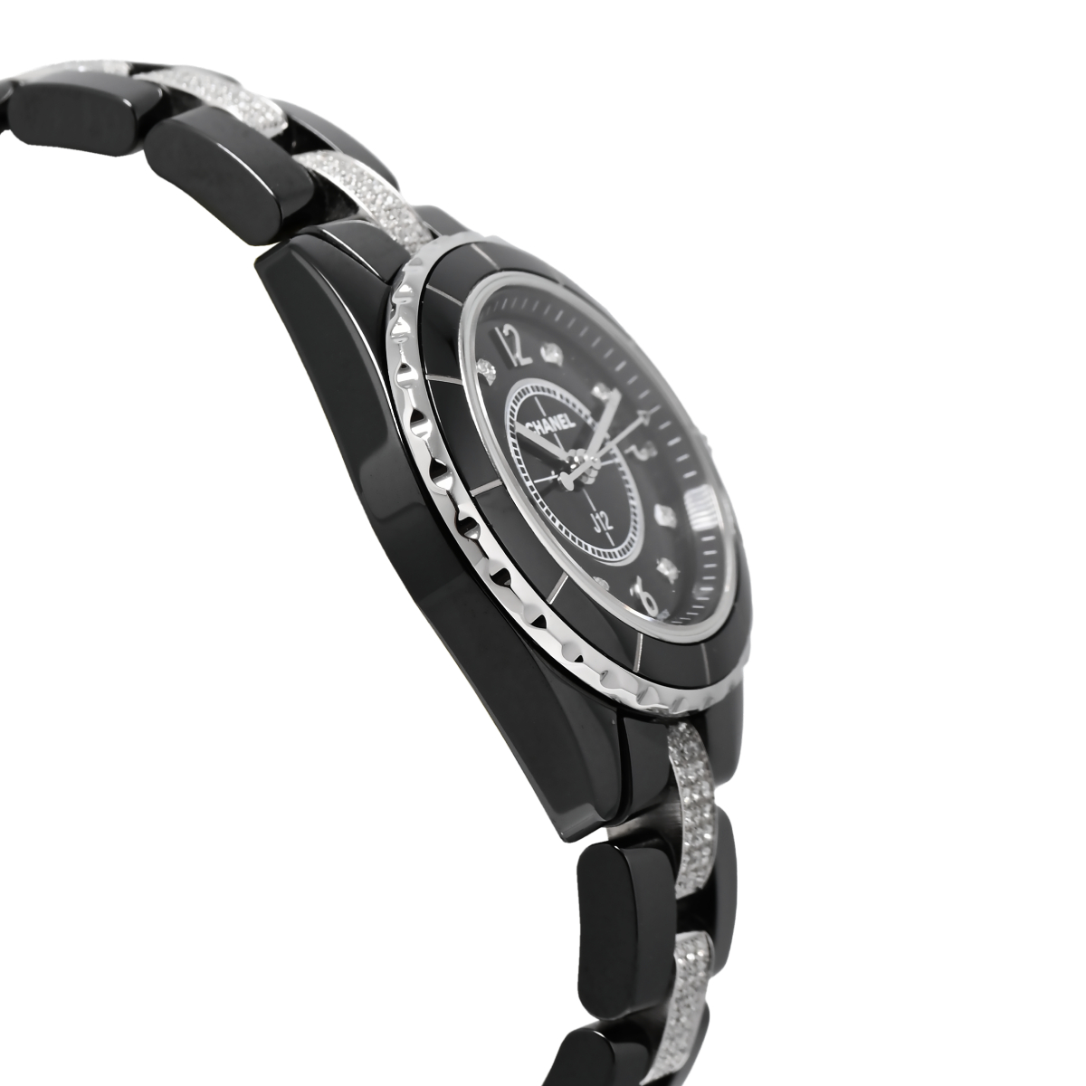 CHANEL J12シリーズのブラックセラミック製クォーツモデル29mmです。傷つきにくく滑らかな肌触りの高耐性ブラックセラミック素材を使用しており8個のダイヤモンドインデックスとブラックラッカーのダイヤルが特徴で華やかな一本です。