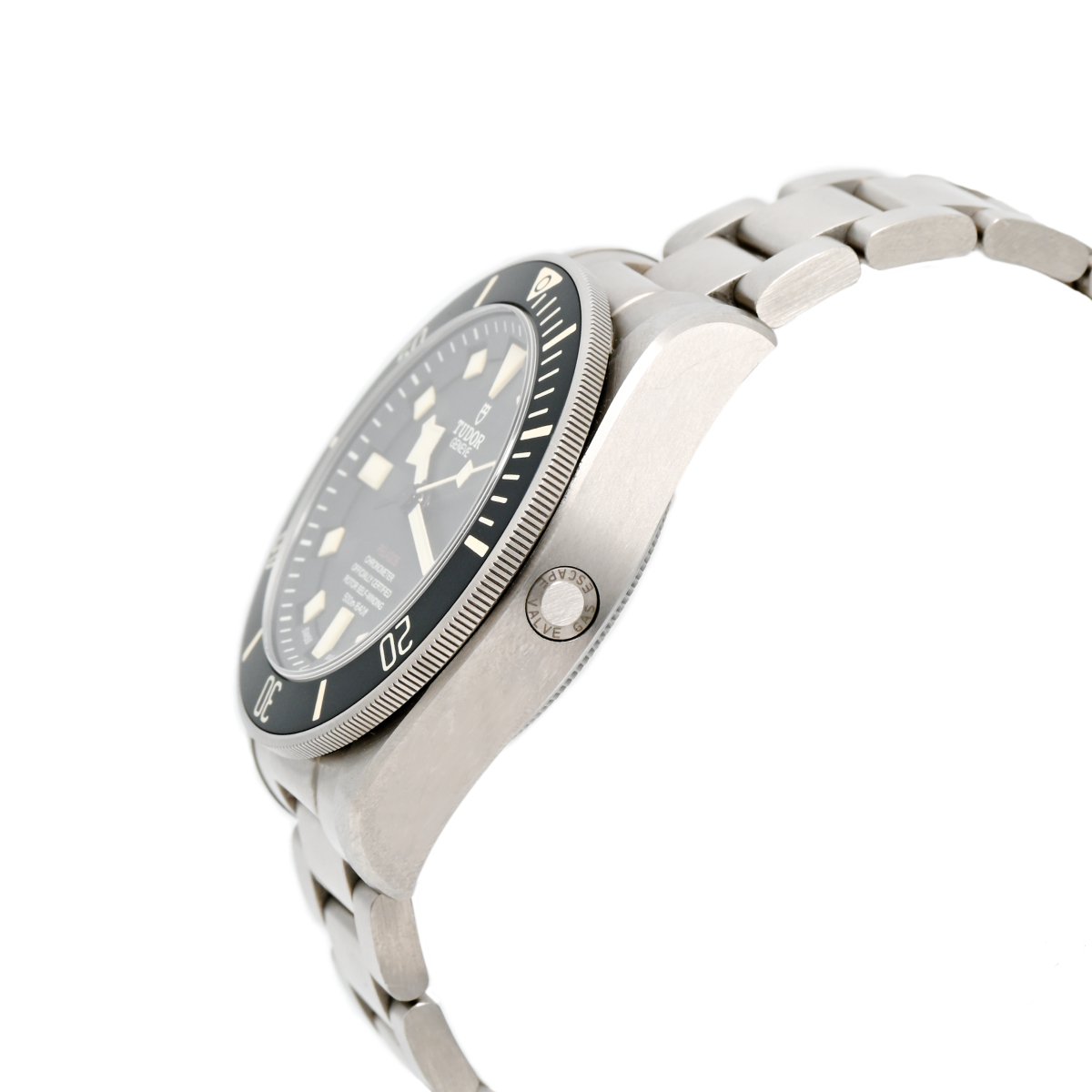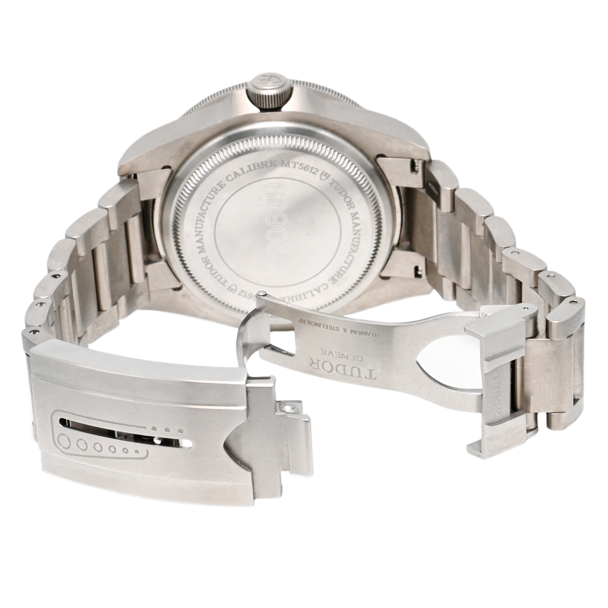 一見すると重厚な佇まいですが、ケースとブレスレットには最高グレードのチタンを採用。ステンレススチールの約60%の軽さでありながら、海水に対する極めて高い耐食性を誇ります。特筆すべきは、チューダーが特許を取得した「自動調整可能スプリングメカニズム」を搭載したクラスプ。水深によってダイビングスーツが圧縮されると、それに合わせてブレスレットが自動で縮み、常に最適なフィット感を維持します。