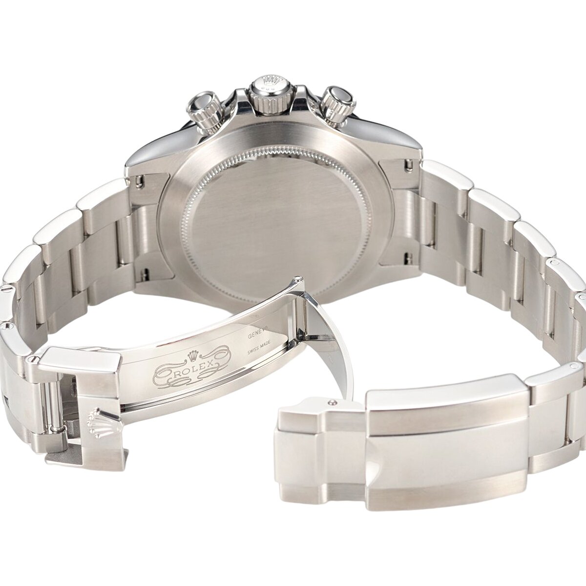 ムーブメントはロレックスが誇るパワーリザーブ約72時間のクロノグラフムーブメント「Cal.4130」を搭載しています。 ケース、ブレスの形状は前作のRef.116520と同様となり、搭載ムーブメントの信頼性や着け心地などは継承されています。ベゼルはPVD(物理蒸着)加工により、プラチナの薄い層でコーティングされたタキメーター目盛りが、高い視認性を実現しています。 艶のあるベゼルが高級感を演出、文字盤とのコントラストを主張し、オンオフ様々なスタイルに合わせやすいラグジュアリースポーツモデルです。